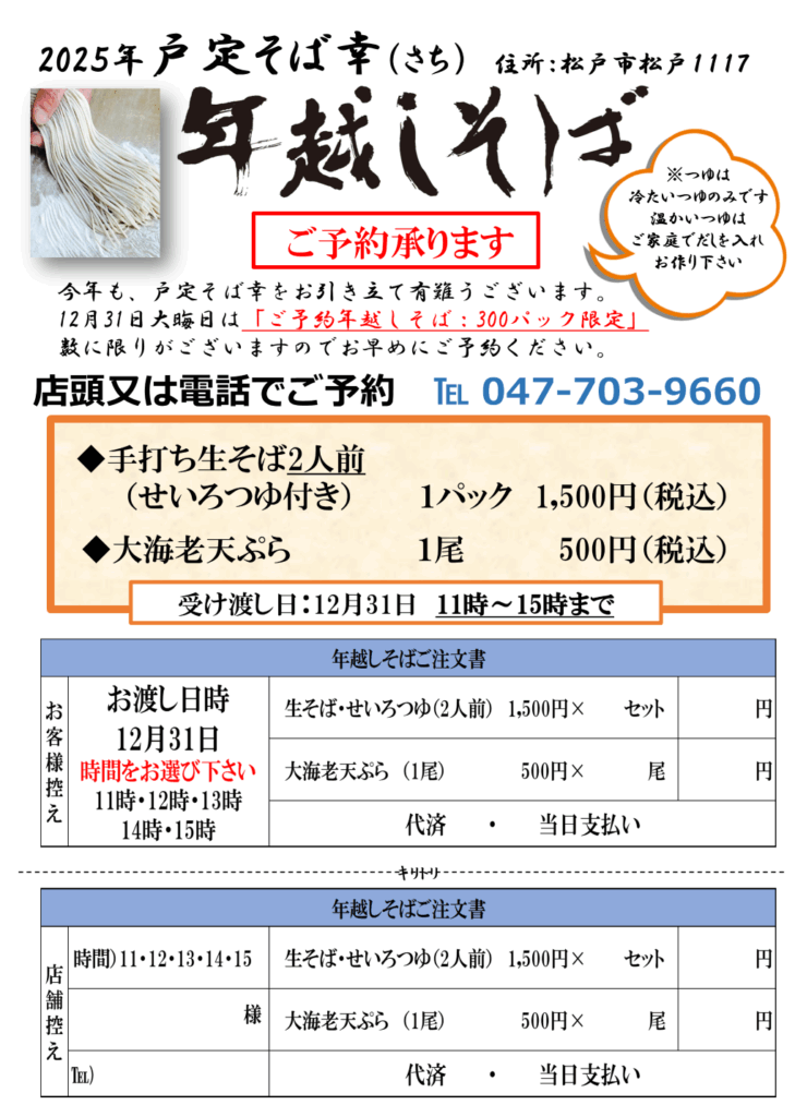 年越しそばの受け渡しは、12月31日(水)のみとなっております。